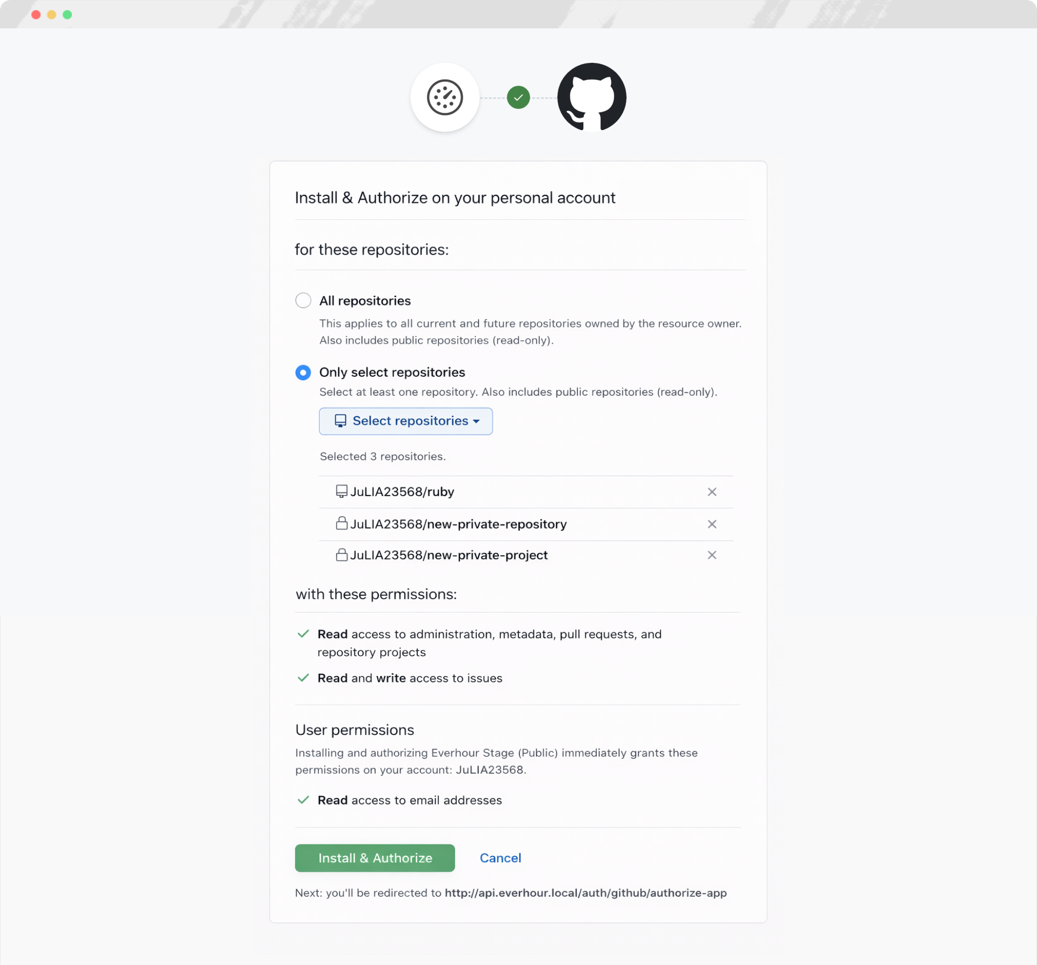 You'll be prompted to connect during signup. To do this, you need to hit 'GitHub' button and let Everhour do the rest, step-by-step. First, you need to install our app in your GitHub account, then authorise it for all or only selected repositories (available only when you have admin rights in GitHub).